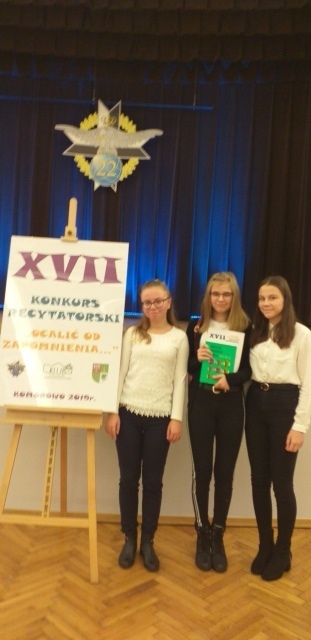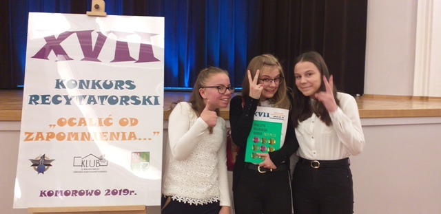 27 listopada odbył się konkurs recytatorski „Ocalić od zapomnienia” Komorowo 2019. Uczennica klasy VII z naszej szkoły - Julia Skłodowska zajęła II miejsce w kategorii klas VII - VIII. W konkurskie wzięły również udział i pięknie się zaprezentowały uczennice z kl. VIII – Weronika Skłodowska i Anna Kurowska. Młodzież zaprezentowała utwory poświecone drugiej wojnie światowej. Do rywalizacji zgłoszono 36 uczestników, recytowało 32. Poziom recytacji był wysoki,