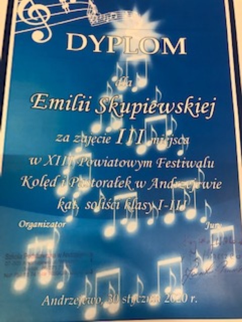 30 stycznia 2020 r. uczennica kl. II Emilia Skupiewska wzięła udział w XII Powiatowym Konkursie Kolęd i Pastorałek w Andrzejewie. Jej wykonanie kolędy „W żłobie leży” zostało docenione przez jury konkursu, które przyznało jej III miejsce w kategorii kl. I-III szkoły podstawowej.